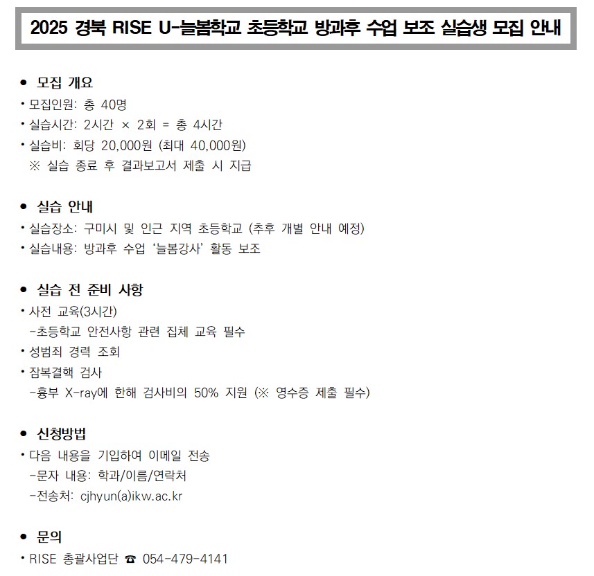 [RISE총괄사업단] 경북 RISE U-늘봄학교 초등학교 방과후 수업 보조 실습생 모집 안내