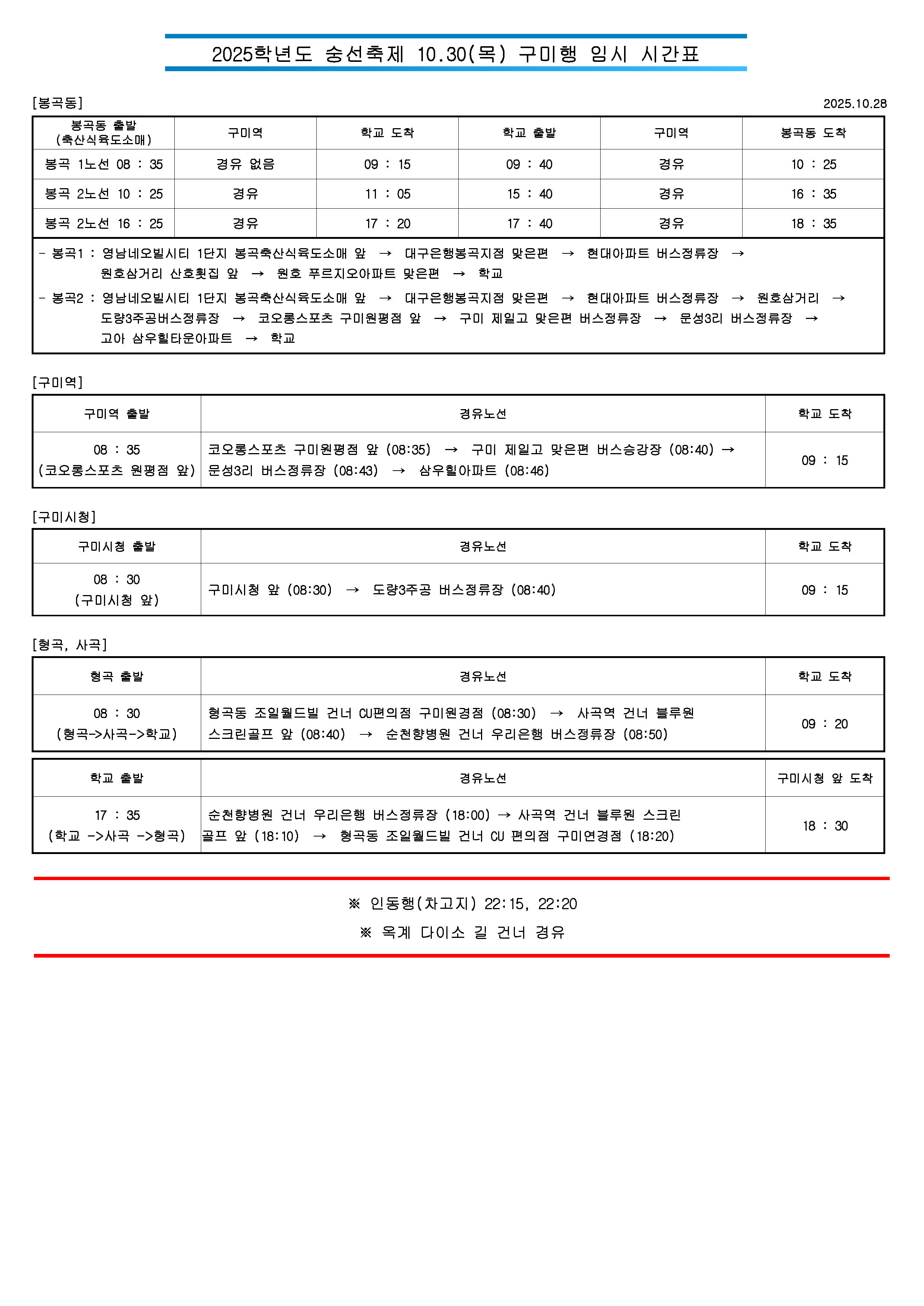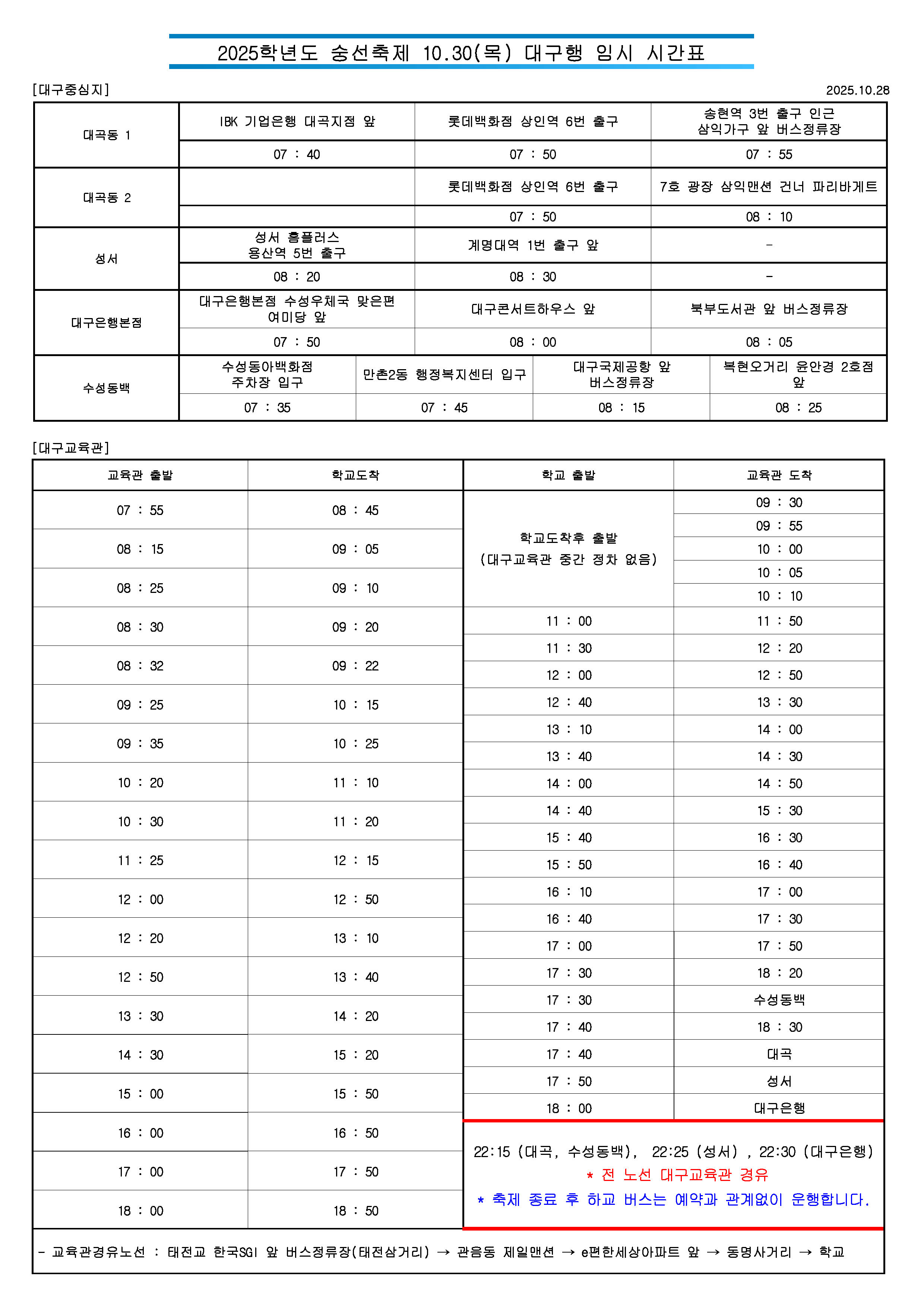 2025. 10. 30(목) 숭선축제 임시 통학버스 시간표 안내