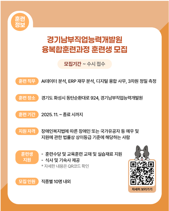 [훈련정보] 경기남부직업능력개발원 융복합훈련과정 훈련생 모집ㅣ모집기간: 수시 접수