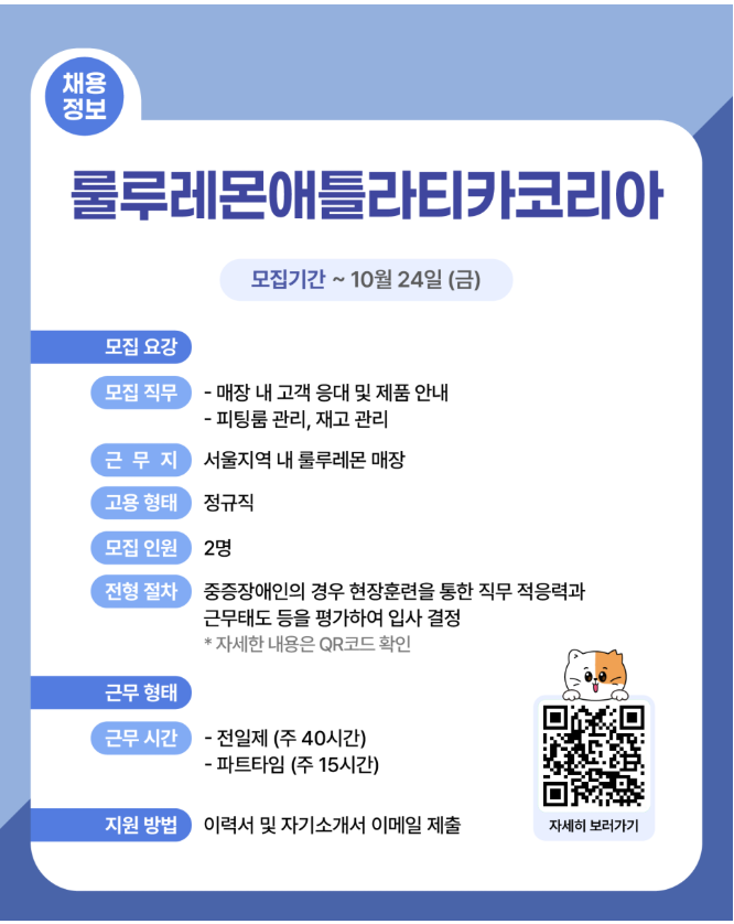[채용정보] 룰루레몬애틀라티카코리아ㅣ모집기간; 10월 24일(금)