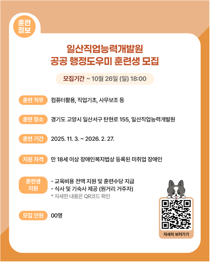 [훈련정보] 일산직업능력개발원 공공 행정도우미 훈련생 모집ㅣ모집기간: 10월 26일(일)18:00