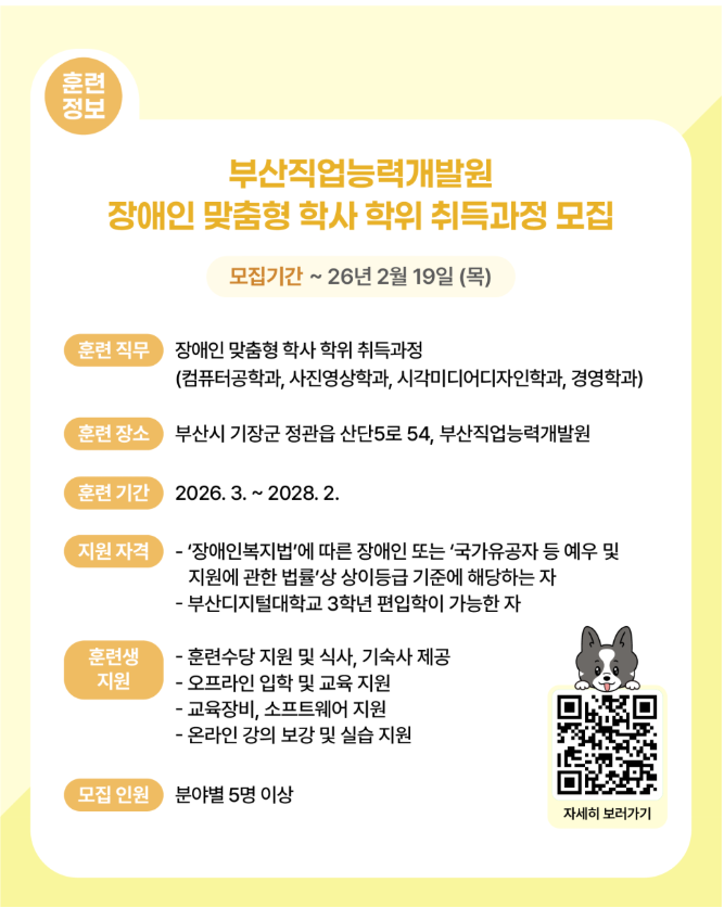 [훈련정보] 부산직업능력개발원 장애인 맞춤형 학사 학위 취득과정 모집ㅣ모집기간: 26년 2월 19일(목)