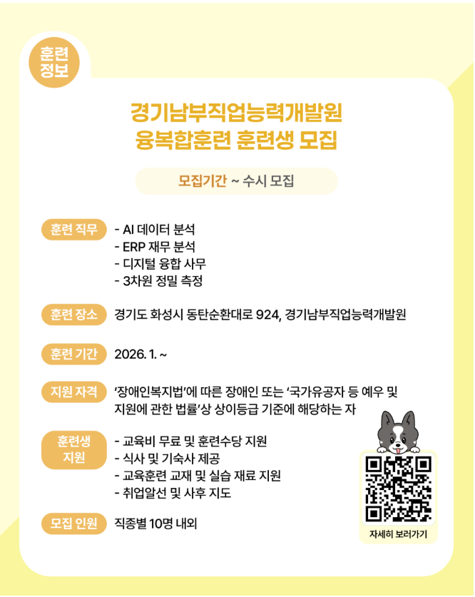 [훈련정보] 경기남부직업능력개발원 융복합훈련 훈련생 모집ㅣ모집기간: 수시모집