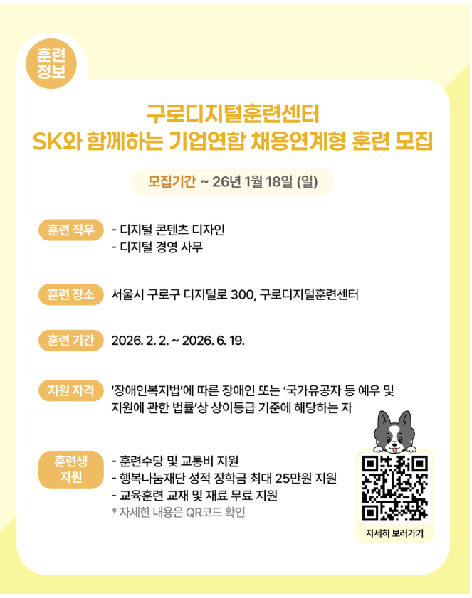 [훈련정보] 구로디지털훈련센터 SK와 함께하는 기업연합 채용연계형 훈련 모집ㅣ모집기간: 26년 1월 18일(일)