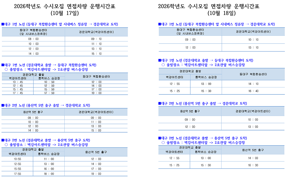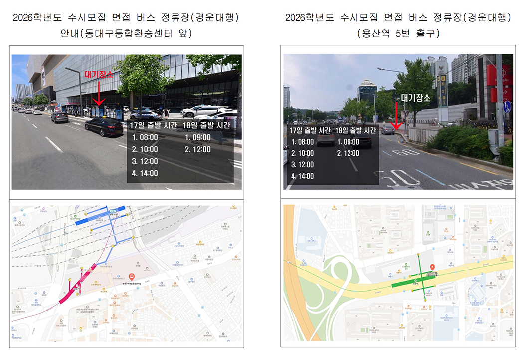 수시모집 면접차량 운행 버스 탑승장소 및 버스 시간표 안내