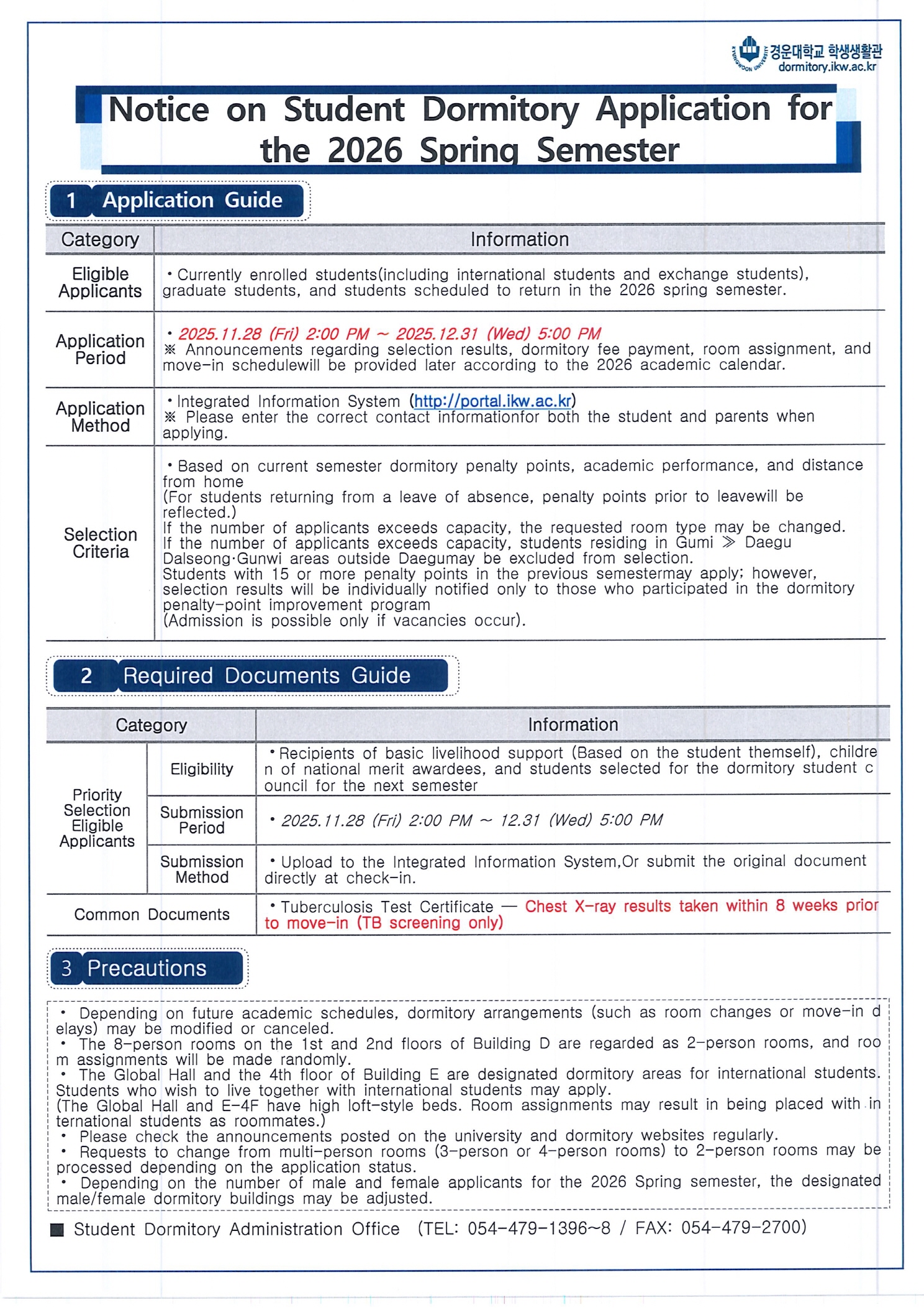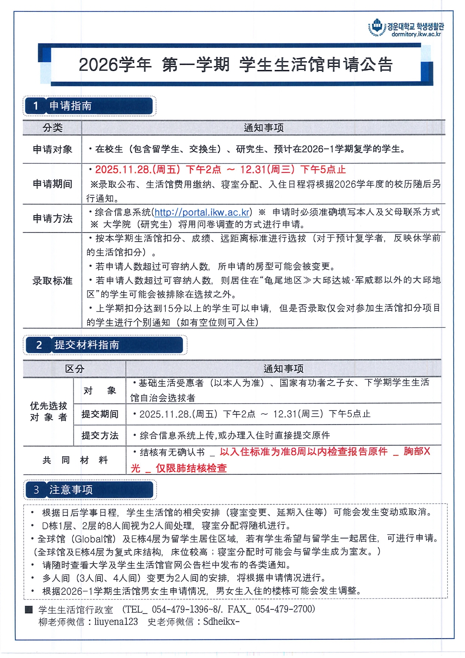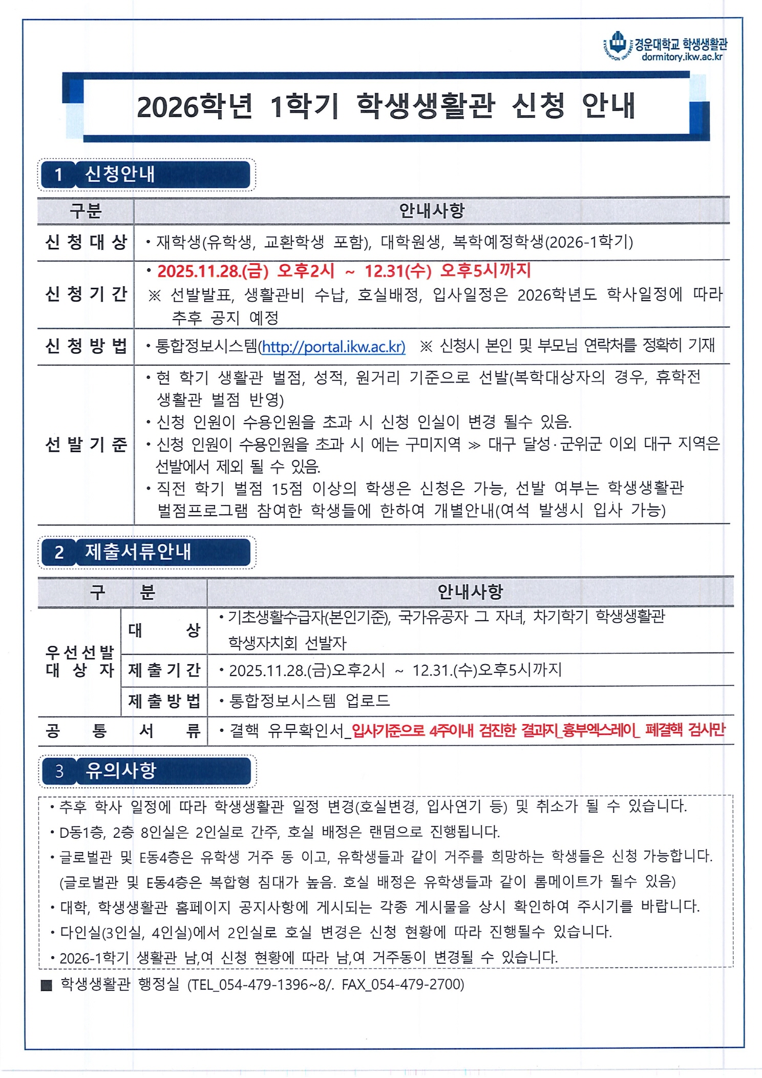 [학생생활관] 2026학년 1학기 학생생활관 신청 안내