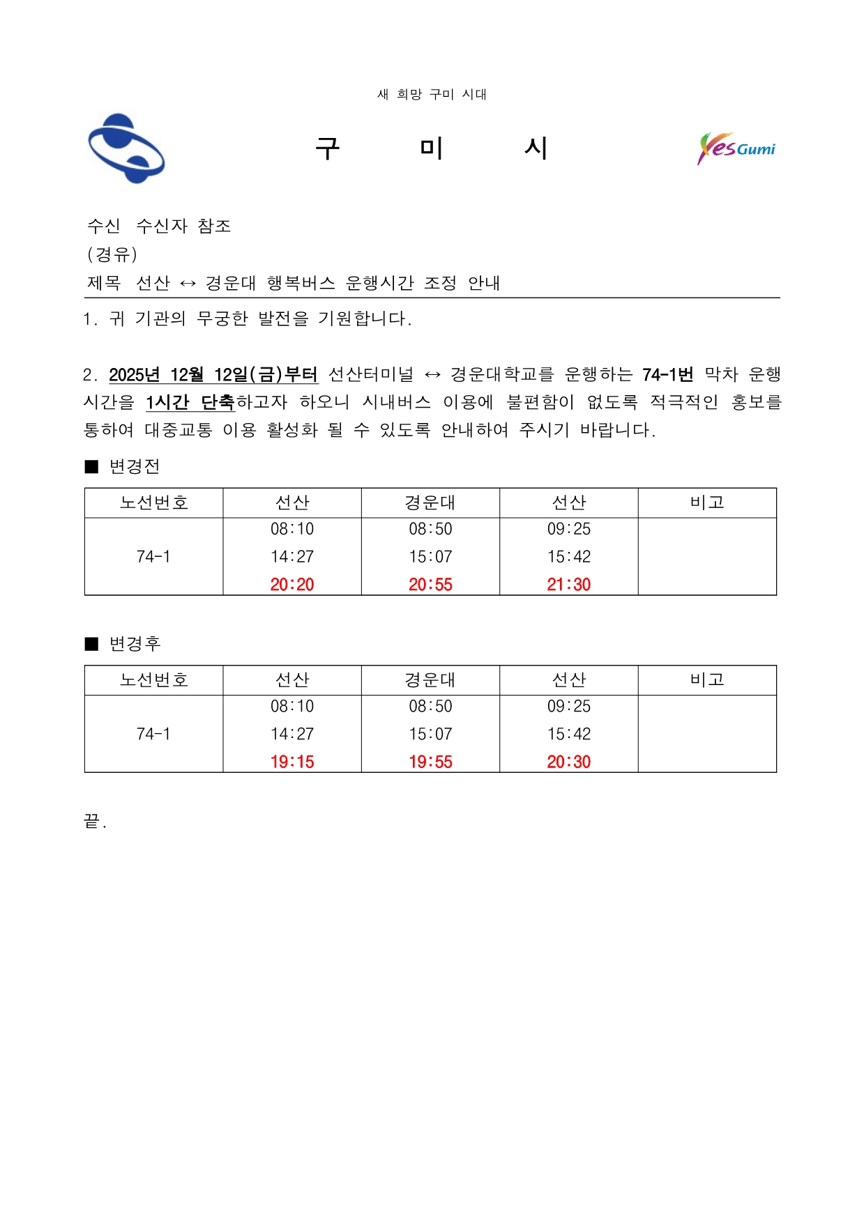 [구미시] 선산경운대 행복버스 운행시간 조정 안내