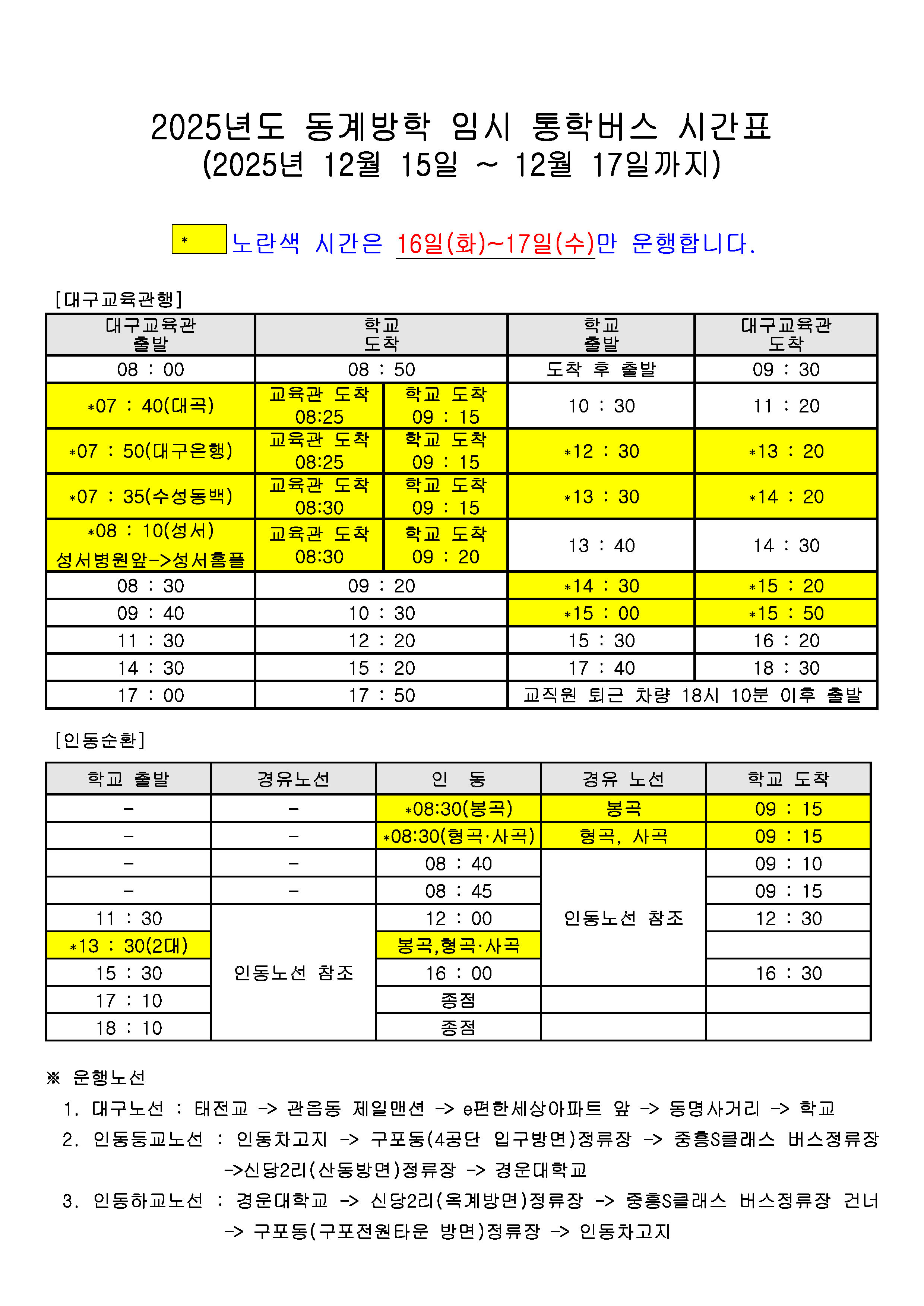 2025학년도 동계방학 중 임시 통학버스 시간표 [12.15(월) ~ 12.17(수)]